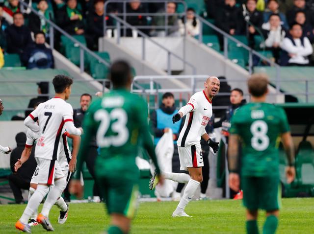 新华社照片,北京,2025年3月29日 3月29日,成都蓉城队球员费利佩(右二)在进球后庆祝。 当日,在2025赛季中国足球超级联赛第三轮比赛中,北京国安队主场1比1战平成都蓉城队。 新华社记者 胡星宇 摄