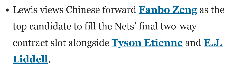 北京时间9月10日,篮网知名队记Brian Lewis撰文解读球队现状,他在文章中谈到了曾凡博的情况,并表示这位中国前锋是篮网最后一个双向合同名额的头号人选。