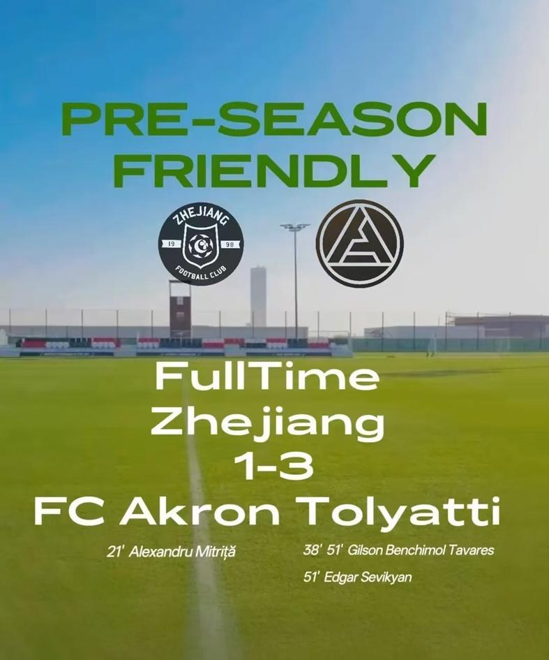 北京时间2月5日,浙江队与俄超球队陶里亚蒂阿克隆进行了一场友谊赛,本场比赛并没有直播,比赛第21分钟,米特里策率先打破僵局,浙江队1-0领先!随后陶里亚蒂阿克隆前锋吉尔松-塔瓦雷斯梅开二度,谢维基扬打进锦上添花的一球,最终浙江队1-3不敌陶里亚蒂阿克隆。