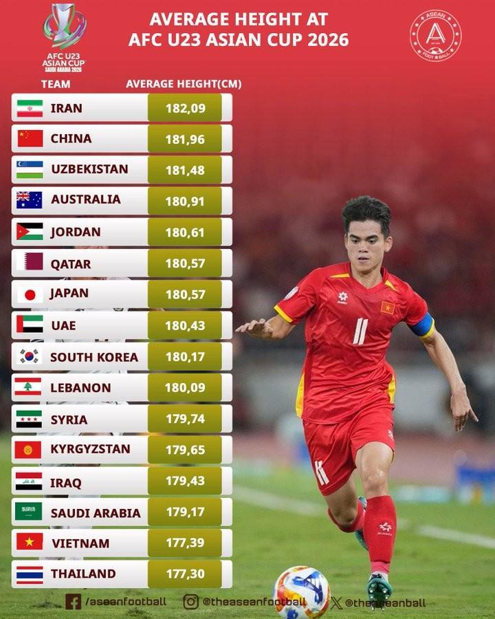 本届赛事,U23国足的平均身高为181.96cm,排名所有参赛队中第2,日本U23的平均身高为180.57cm,排名第7。U23国足的平均身高要比对手高出1.39cm。